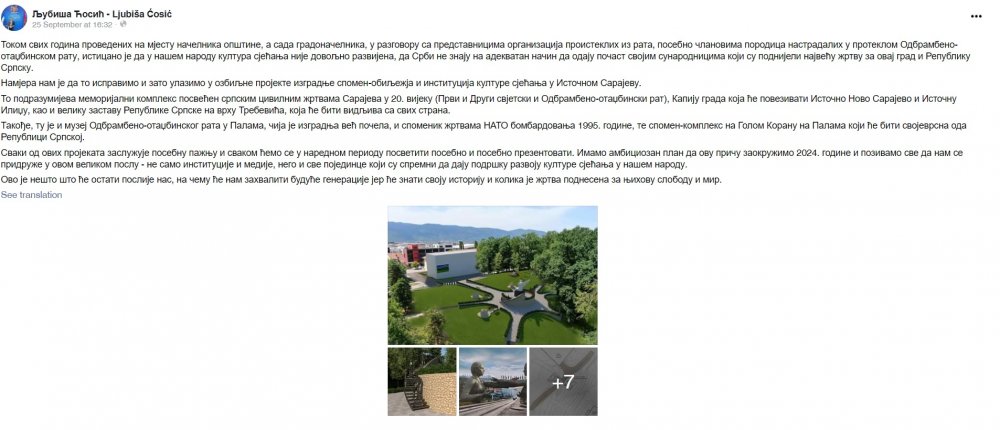 - Svaki od ovih projekata zaslužuje posebnu pažnju i u narednom periodu ćemo se posvetiti i predstaviti i posebno se predstaviti. Imamo ambiciozan plan da ovu priču zaokružimo 2024. godine i pozovemo sve da nam se pridruže u ovom velikom poslu- ne samo institucije i medije, nego i sve pojedince koji su spremni da daju podršku razvoju kulture sjećanja u našem narodu. Ovo je nešto što će ostati nakon nas, za što će nam buduće generacije zahvaliti jer će znati svoju historiju i koliko je žrtvovano za njihovu slobodu i mir, napisao je Ćosić na svom Facebook profilu.