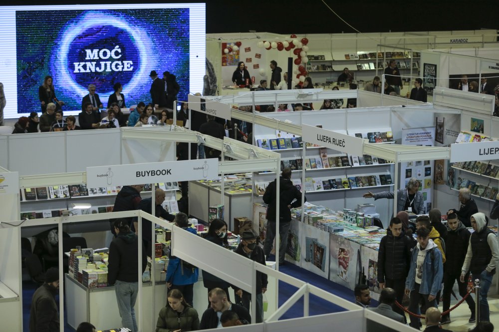Sarajevo, BiH - 20. april 2022: Počeo je 33. Međunarodni sarajevski sajam knjiga i učila na kojem učestvuje više od 100 izdavača iz Bosne i Hercegovine, regiona i svijeta. Na sajmu, koji traje do 25. aprila u sarajevskoj dvorani "Mirza Delibašić" u Centru Skenderija, predstavit će se izdavači sa oko 30.000 naslova iz Bosne i Hercegovine, Srbije, Hrvatske, Turkiye, Saudijske Arabije, Švedske, Danske, Norveške, Sjedinjenih Američkih Država, Irana i Njemačke.