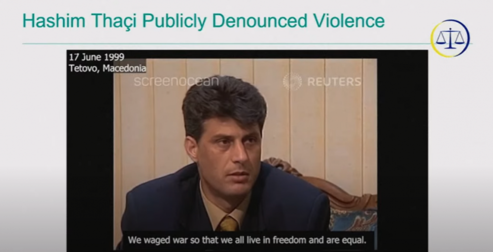 Odbrana je pustila i video snimke u kojima Tači poziva pripadnike srpske zajednice da se vrate na Kosovo, te poručili kako se zalagao za demilitarizaciju OVK, toleranciju i multietničke institucije.