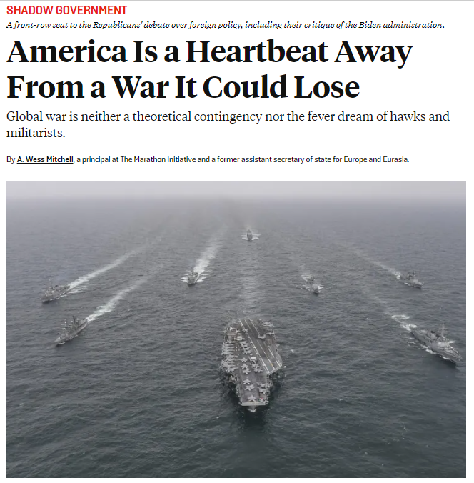 U slučaju kineskog napada na Tajvan, Sjedinjene Države bi se našle pod teškim pritiskom da odbiju taj napad dok istovremeno održavaju isporuke pomoći Ukrajini i Izraelu. Najgori mogući scenarij je eskalirajući rat na najmanje tri međusobno udaljena područja, koji bi tada vodila razvučena američka vojska uz loše opremljene saveznike koji se uglavnom ne mogu odbraniti. Vođenje ovakvih borbi zahtijevalo bi nacionalno jedinstvo, mobilizaciju resursa i spremnost na žrtvu kakvu Amerikanci i njihovi saveznici nisu iskusili generacijama.