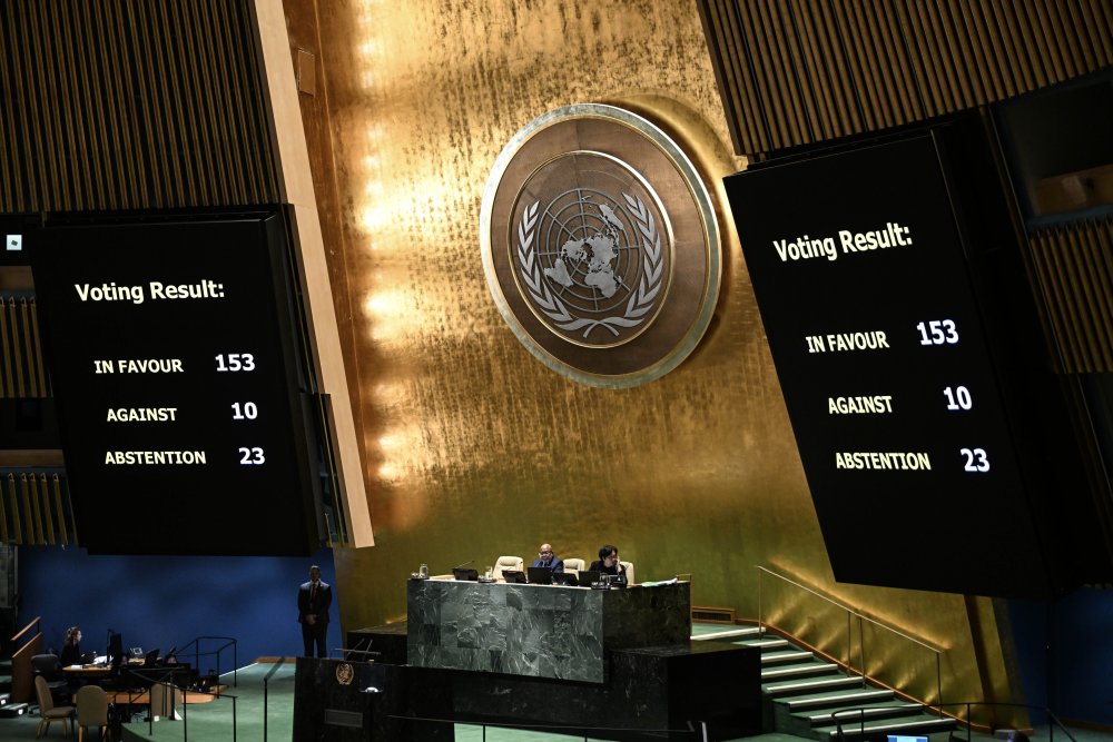 Deset zemalja među kojima su Sjedinjene Američke Države, Izrael i Austrija, glasalo je protiv rezolucije, dok su 23, uključujući Veliku Britaniju, Njemačku, Italiju i Ukrajinu, bile suzdržane od glasanja.