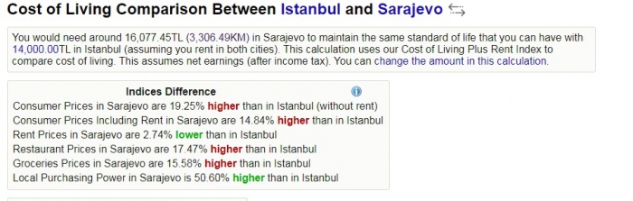 No, da biste u Sarajevu im ali isti standard života kao u Istanbulu sa 14.000,00 TL, bilo bi potrebno 16.077,45 TL odnosno 3.306,49 KM. Idemo dalje, potrošačke cijene bez najma u sarajevu su za 19,25 posto više nego u Istanbulu, dok su potrošačke cijene sa uključenim najmom u Sarajevu više za 14,84 posto nego u Istanbulu.