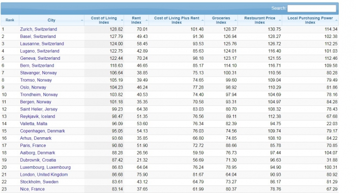 Na prvom mjestu najskuplji grad u Evropi je Zirich u Švicarskoj, a najjeftiniji Ternopil u Ukrajini.