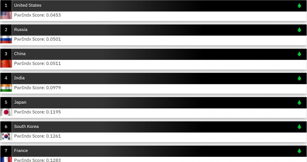 Prema podacima Global Firepower-a, na samom vrhu je SAD, zatim Rusija, Kina, Indija a među prvih deset najjačih našle su se Japan, Južna Koreja, Francuska, Velika Britanija, Pakistan i Brazil.